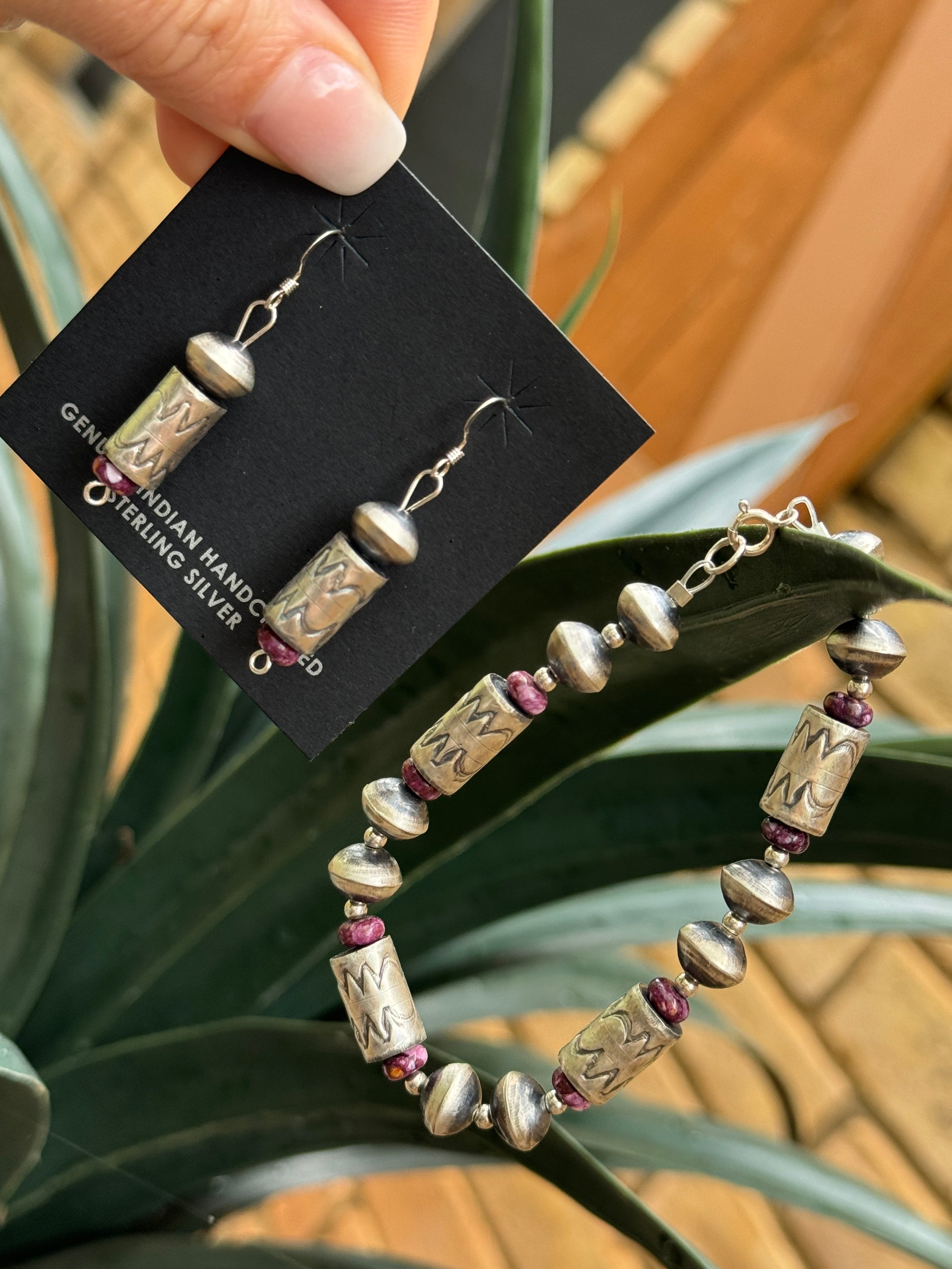 Stamped Navajo pearl and spiny oyster bracelet and earrings set